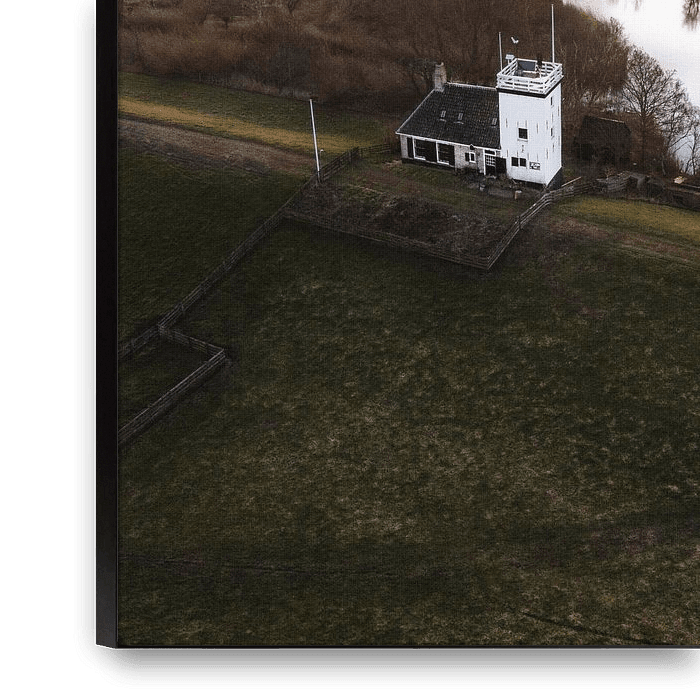 In the vast Frisian landscape, the Workum lighthouse stands as a tranquil beacon in the flat countryside. From the air, you can see how the white building nestles on the edge of a mirror-like pool of water, surrounded by reeds and open meadows. The soft evening light casts a warm glow over the fields and makes the ditches run like…