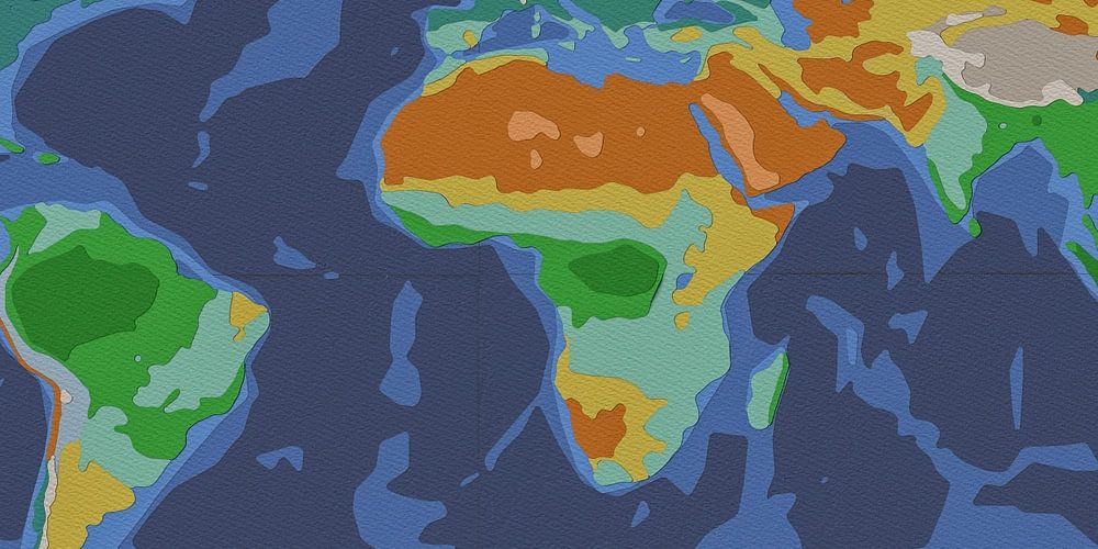 The colours roughly represent the climate and landscape zones on our planet. We see, in green and dark green, the tropical jungles around the equator. In lighter green the savannahs, in yellow the steppes and in orange-brown the deserts. In the temperate latitudes, we see a relatively light green for deciduous forests and a slightly darker green for the boreal coniferous forests. Above that, another greenish grey for the tundra. Furthermore, the high mountains and ice caps also have their own papers.