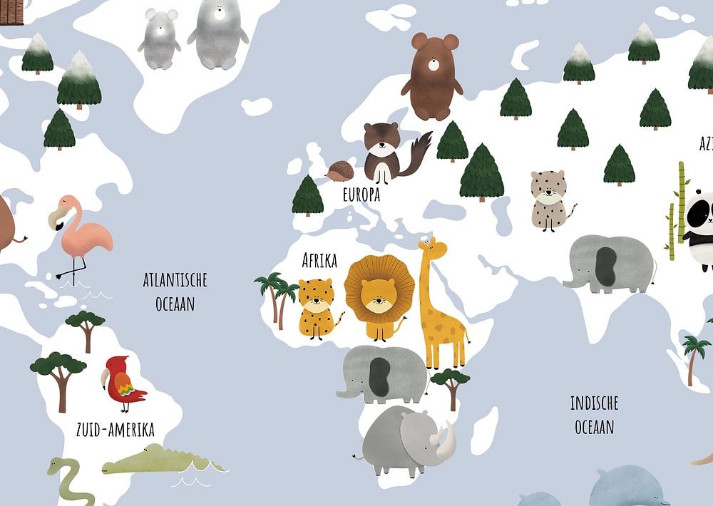 Bring the world to life in the nursery with this cheerful animal world map! On this colourful world map you can discover together with your little one which animals live where in the world. From elephants in Africa to penguins in Antarctica; each continent is illustrated in a playful way with recognisable animal figures. The map is not only educational, but also a real eye-catcher on the wall.