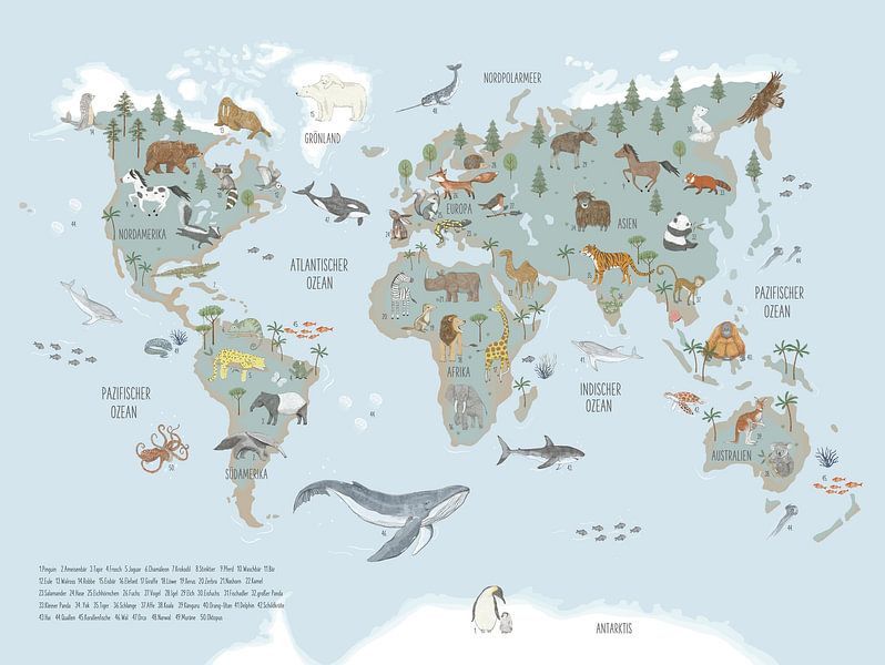 Buy this illustration World map of animals bleu by Marion Lesnik on canvas, ArtFrame, poster and wallpaper, printed on demand in high quality.