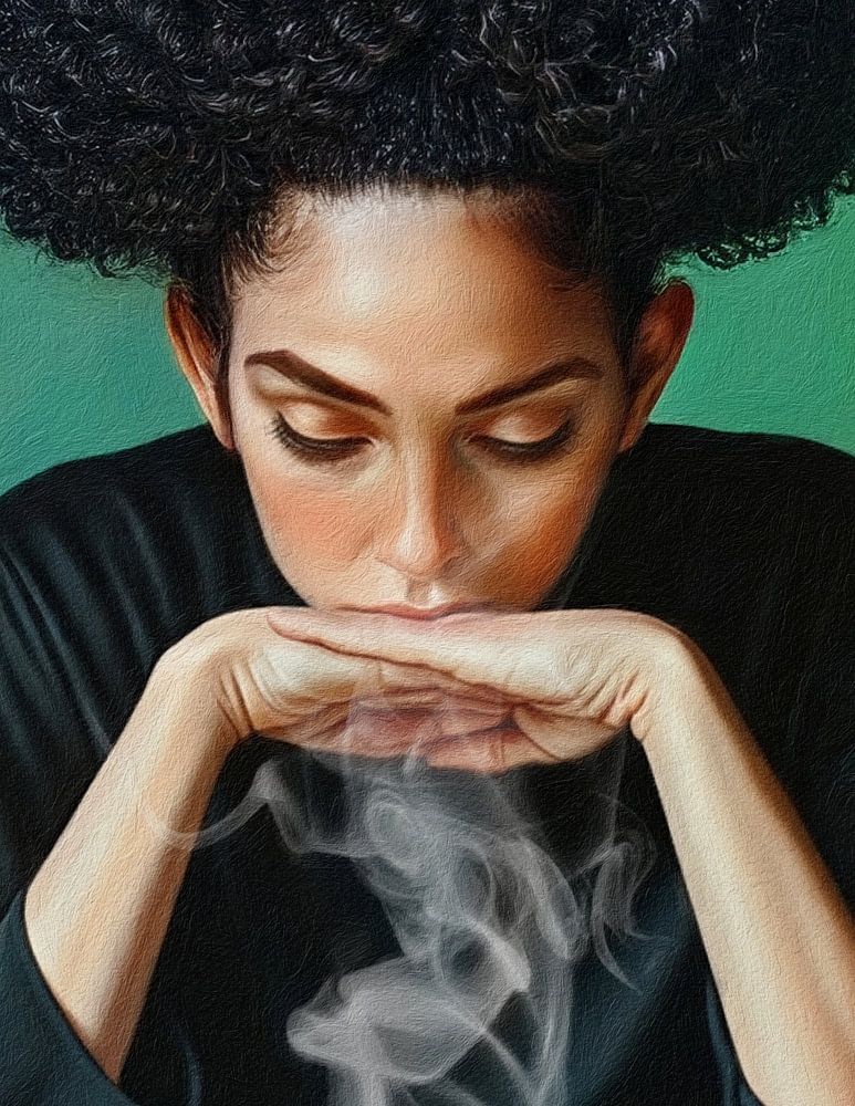 The composition, with its gentle focus on the woman and the teacup, creates a serene and contemplative atmosphere. The contrast between her dark hair and clothes and the light steam and detailed cup highlights the details. The calm, plain green background adds to the sense of calm and tranquillity. An elegant and timeless addition to any room, this artwork is great for the cold autumn and winter months due to its warm use of colour and hot tea.