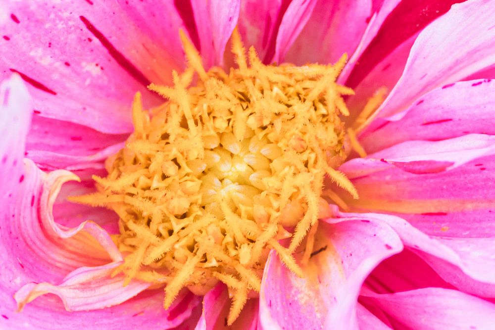 A macro picture of a pink dahlia with a yellow heart. The petals look like drawn.