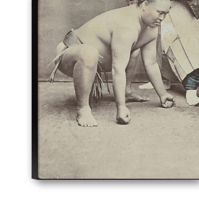 Here, two sumo wrestlers with a referee are ready for a fight.