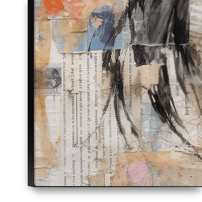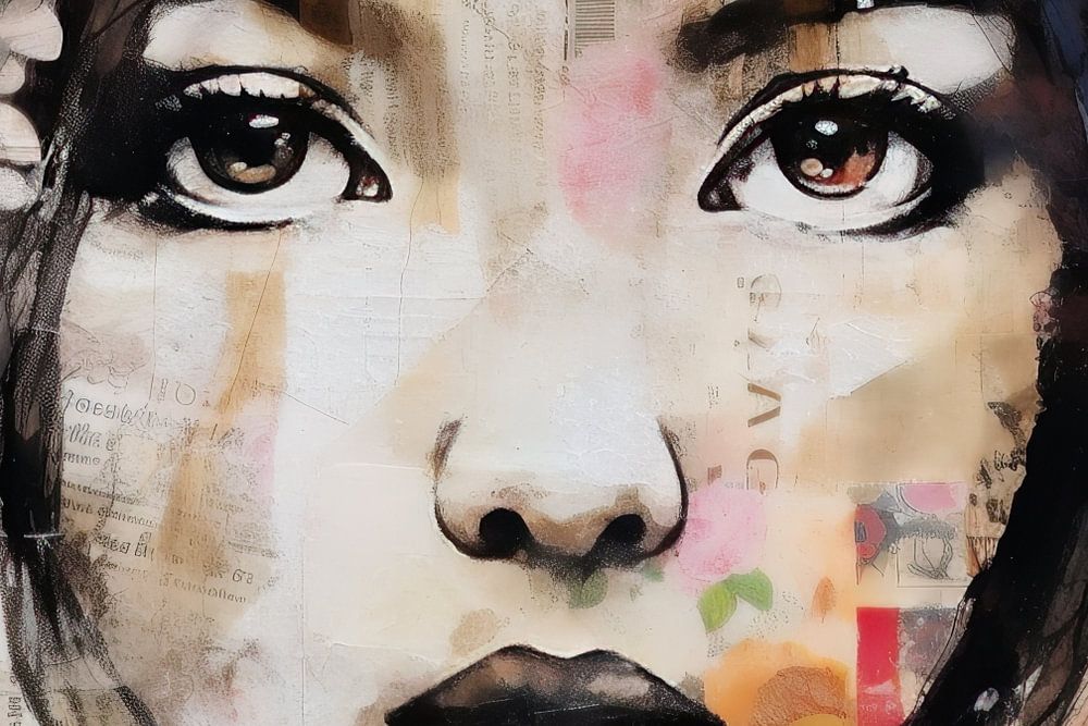 Yara Portrait - abstract painting / mixed media art painted. Nice contrast between sophisticated portrait and raw collage/painting technique.