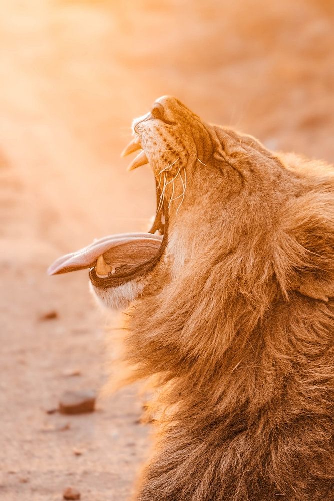 This photo captures an impressive scene: a majestic male lion, gaping against the backdrop of a mesmerising sunset. The image was captured during an unforgettable safari in Hoedspruit, located in South Africa's vast Greater Kruger National Park.