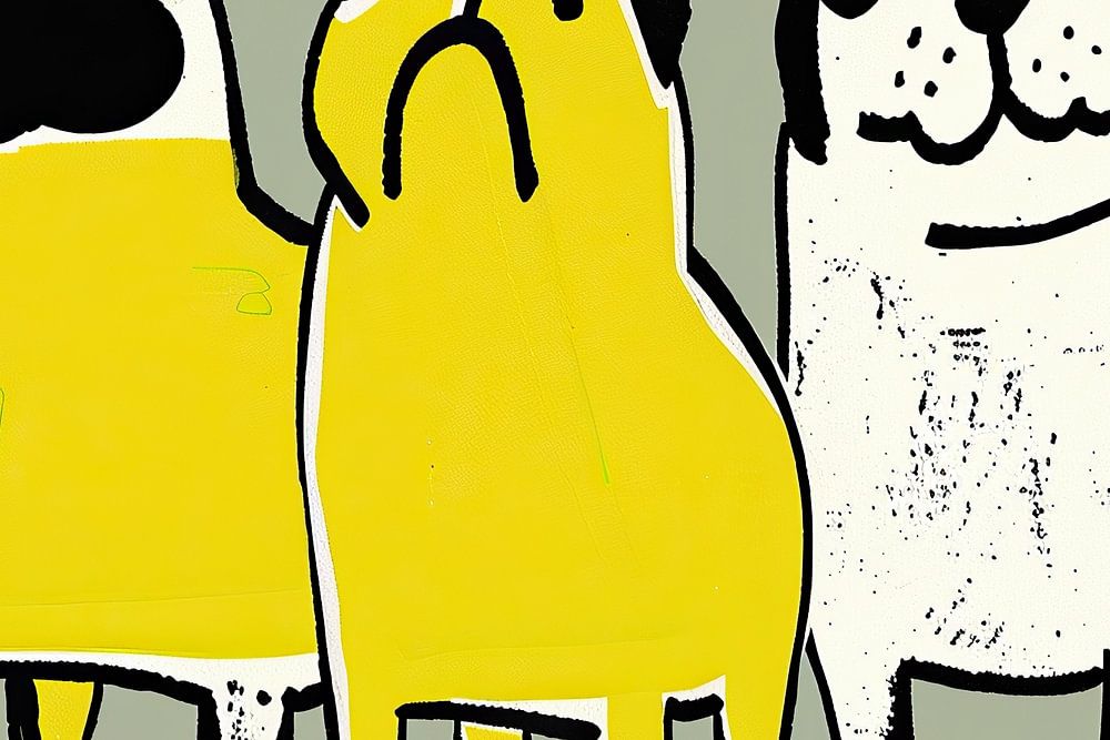 Details: dogs, artwork, yellow, green, animal, cartoon, expression, simplicity, animal portrait, friendship