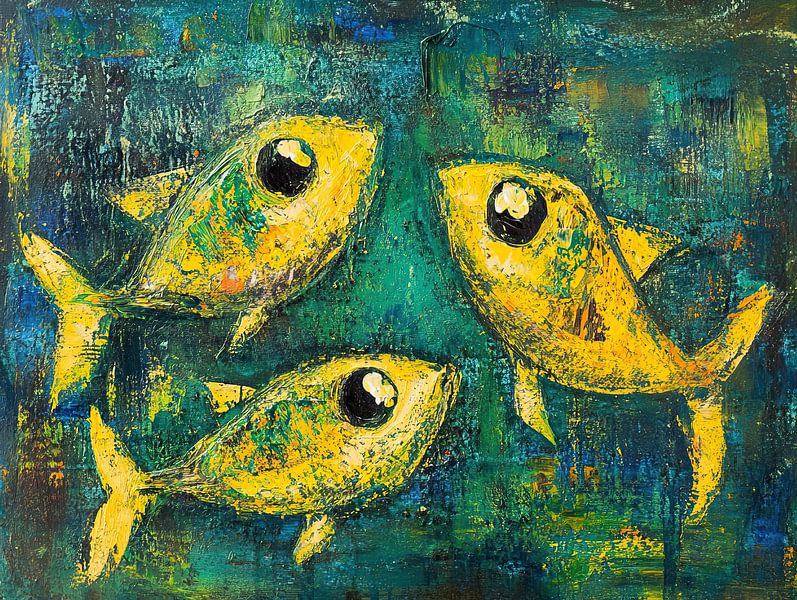 Yellow Fish - This fish painting depicts three striking yellow fish with large black eyes swimming against a bright blue background with abstract textures.