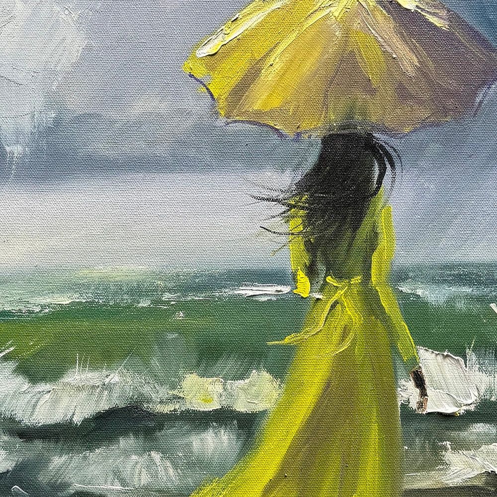 This vibrant oil painting, channeling the bold color contrasts of Impressionists like Van Gogh alongside the brooding mystique of Celtic seascapes, features a resolute woman standing as a beacon of strength on the tempestuous shores of Ireland or Wales. Draped in a brilliant yellow gown that flows like sunlight piercing the gloom, she…