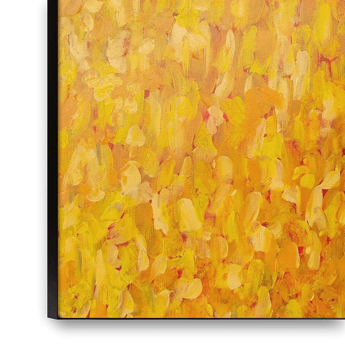 A colourful 100x100 cm canvas with the colours yellow , red and orange. The acrylic paint is set up almost pointillistically.
