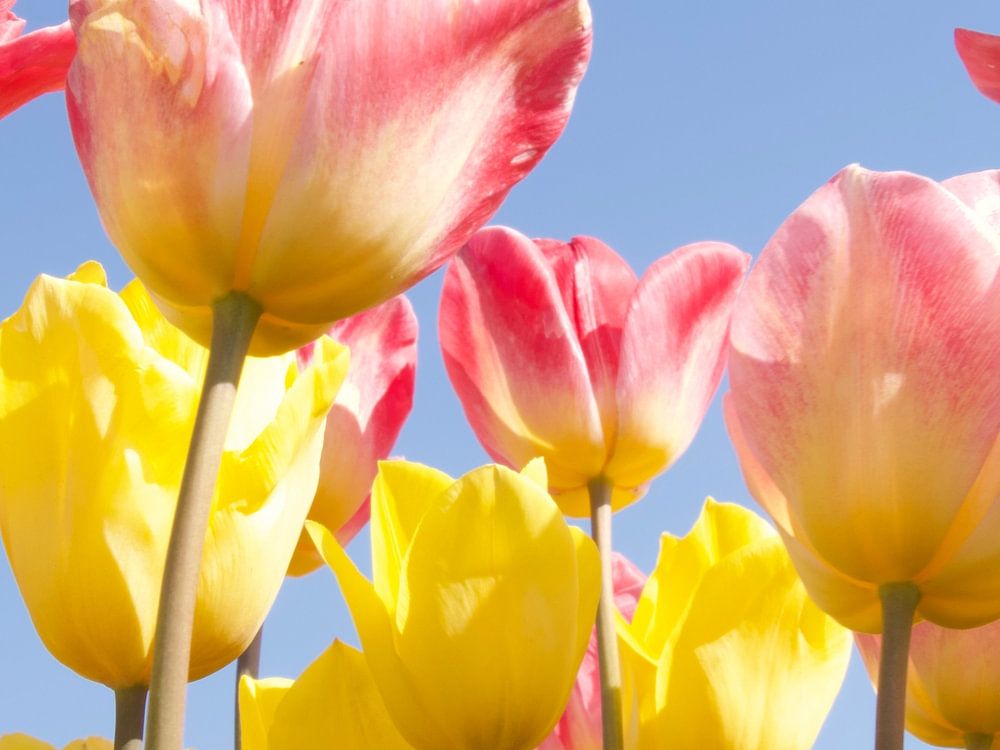 Yellow and pink tulips against a blue sky by Judith van Wijk