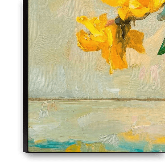 A vibrant play of colours unfolds in the vase, where radiant yellow flowers bloom in full splendour. Their gentle, curved shapes and the lively contrast to the calm background colour lend the scene a cheerful lightness. An expression of nature that brings hope and joy to any room.