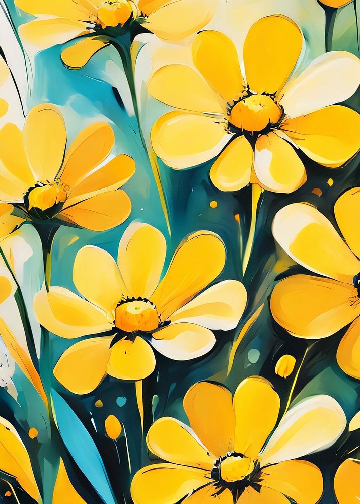 This radiant abstract artwork depicts a vibrant bouquet of yellow flowers. Loose, flowing colour accents evoke a sense of movement, as if the flowers were gently moving back and forth in a summer breeze. It exudes warmth and optimism, perfect for brightening up any room with its cheerful and uplifting energy.