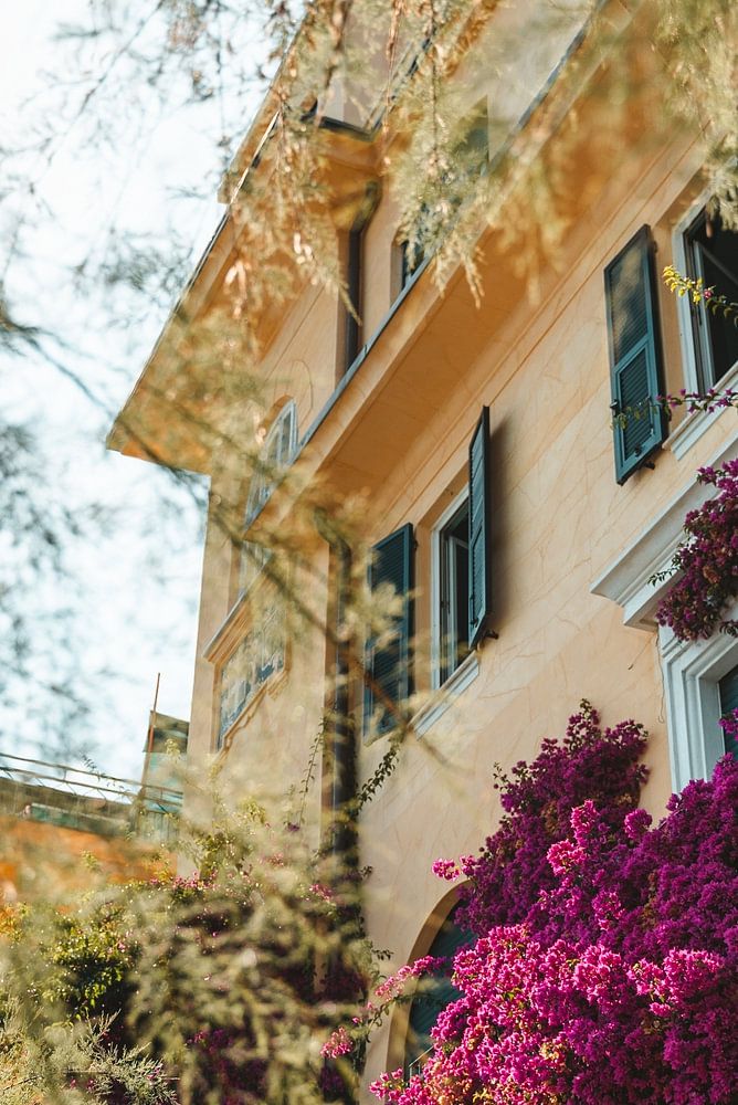 This beautiful yellow house with its purple Mediterranean lavender flowers (Bougainvillea) is located in Monterosso al Mare in Italy near the coast.