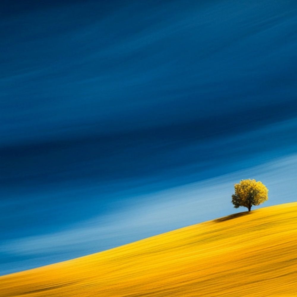 A vast yellow natural landscape with a sea of sunflowers standing proudly in the sun. The bright yellow flowers reach for the sky, while a gentle breeze rustles the leaves. The sun shines brightly across the field, and the photo is a play of intense blues and yellows, completing the peaceful scene.
