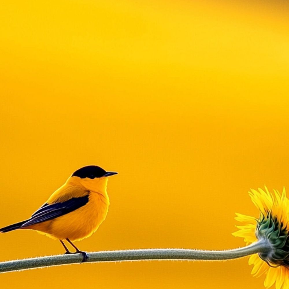 A vast yellow natural landscape with a sea of sunflowers standing proudly in the sun. The bright yellow flowers reach for the sky, while a gentle breeze rustles the leaves. The sun shines brightly across the field, and the photo is a play of intense blues and yellows, completing the peaceful scene.