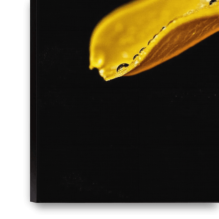 With soft contours and radiant yellow, this flower unfolds like an elegant mystery. The shiny water droplets seem to capture the freshness of nature, while the dark background skilfully accentuates the vibrant colour. Perfect for the living room, this work of art creates a relaxing, harmonious atmosphere.