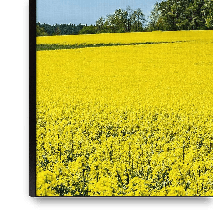 Buy this landscape artwork Yellow rapeseed field at spring season with blue cloudy sky and forest background by Alex Winter on canvas, ArtFrame, poster and wallpaper, printed on demand in high quality.