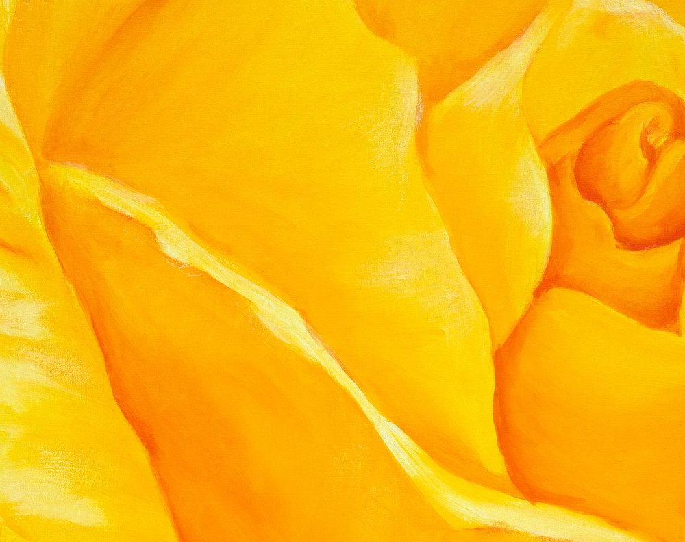 Yellow rose detail is an acrylic painting on canvas in landscape format painted by the artist Karen Kaspar. It shows the inner petals of a beautiful rose blossom in bright yellow and orange colours.