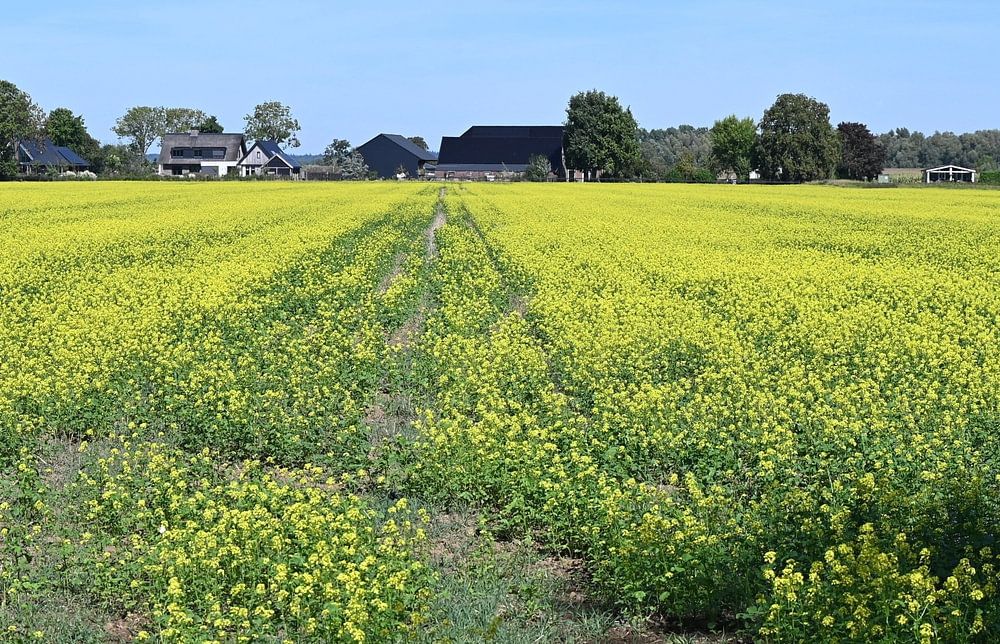 A sea of yellow stretches under a bright blue sky. The flowers gently sway in the breeze, while the path between the rows invites a walk full of fragrance and colour. Here the land blooms, and with every step the wonder grows.