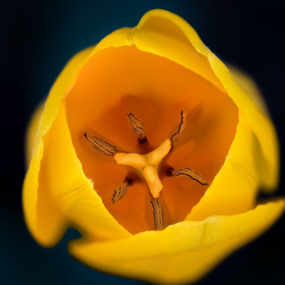 Macro image of a bright yellow tulip from above. In this square image I placed it in the center, made it pop out even more by means of the dark, black and blue background .