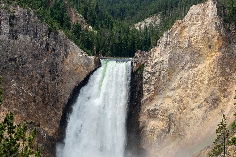 Yellowstone National Park is a national park in the United States, mainly in Wyoming, but with small sections in the neighbouring states of Montana and Idaho. Yellowstone covers an area of 8983 km², making it immediately one of the largest national parks in the United States. The average elevation in the park is 2440 metres. Most of the park in Wyoming consists of forest. The park is home to many animal species, including bison, deer, several species of bear, coyotes and wolves. The park contains over 800 kilometres of paved roads and twice as many kilometres in hiking trails. To the south, Yellowstone connects to Grand Teton National Park.
