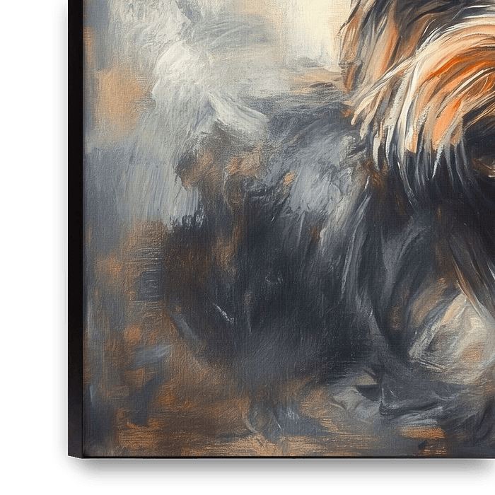 A small, fluffy dog with expressive eyes and attentive ears is depicted against a soft, blurred background. The dog has a lively expression and its fur is painted in shades of brown and grey.