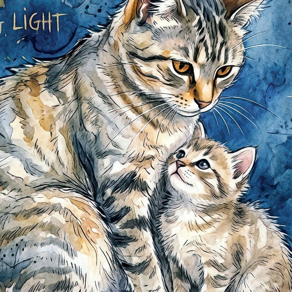 A mother cat sits close to her kitten, both surrounded by a dazzling play of blue and gold. Words evoking a sense of closeness and light are scattered across the background.