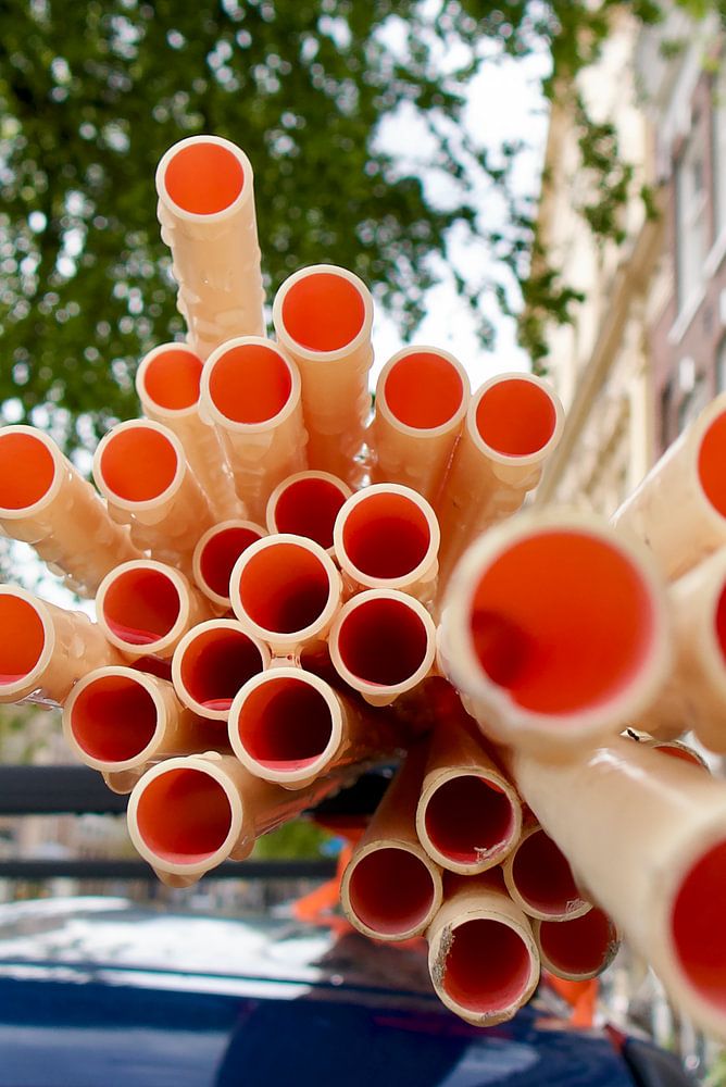 Photo of a package of pipes on a car in Amsterdam with a nice orange interior. Deliciously Dutch.