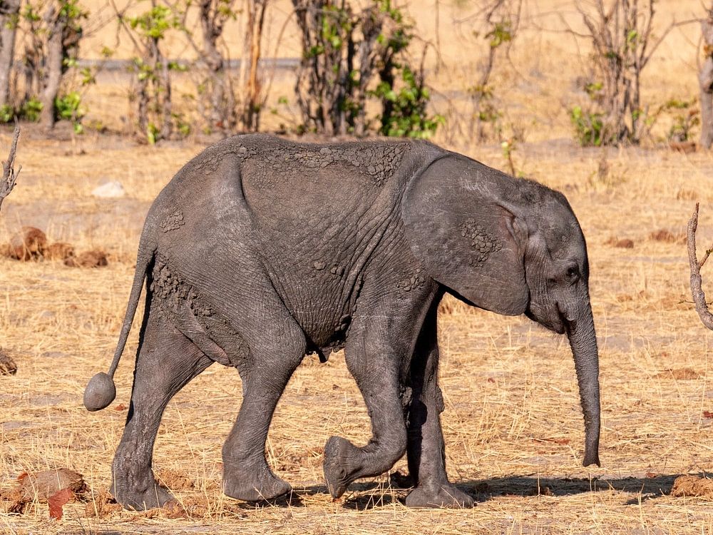 A young, baby African elephant (Loxodonta Africana) in Hwange National Park in search of water at the end of the dry season. Skinny elephant.