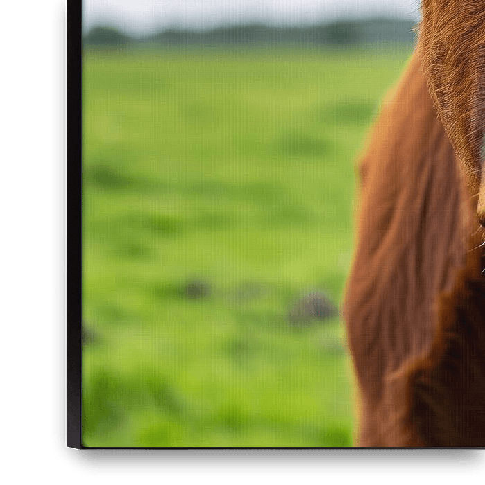 This touching portrait, "Young Cow on a Lush Meadow", captures the innocence and curiosity of a young cow in a green setting. The cow's warm brown tones stand out against the fresh, lush green of the meadows, under a cloudy sky that evokes a rustic and natural atmosphere. Her large, expressive eyes and soft fur give the image…