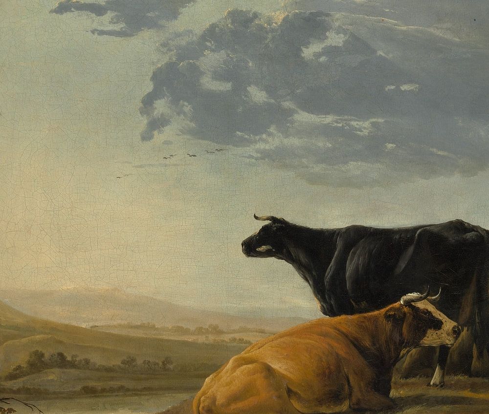 Sunlit clouds skimming across the sky dominate this tranquil landscape, a classic example of the luminous style that made Cuyp a favoured artist among eighteenth- and nineteenth-century collectors. Based on studies made in nature, the painting is nevertheless a studio production. Resting cattle and agricultural labourers appear as timeless parts of the landscape in a reassuring vision for the landowners able to display such a monumental scene.