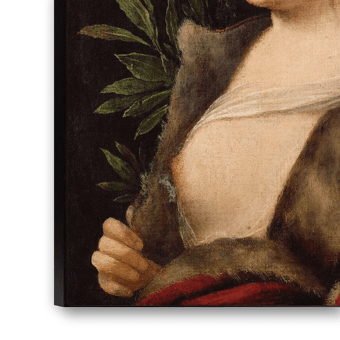 The half-length portrait depicts a young woman in a fur-trimmed red cloak. Muted colouring and the fine Venetian shading of sfumato, actually adopted from Leonardo, combine with the sensual character of the subject to produce a convincing unity. A white veil is wrapped across the young woman’s coiffured hair and falls in a gentle arc over the soft skin of her upper body. Right behind her, set off against a dark background, rises a vigorous laurel-tree.