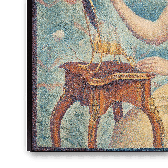 This work is the only major portrait painted by Georges Seurat, who died at the age of 31. It depicts his companion, Madeleine Knobloch, applying make-up. The theme of nature and artifice, represented by the use of cosmetics, is echoed in Seurat's distinctive technique, called ‘pointillism’. He applied a ‘skin’ of coloured dots to the surface of his work to animate it and create volume. Following newly formulated optical theories, he placed colours from opposite sides of the colour wheel — orange and blue, pink and green — next to each other for greater contrast.