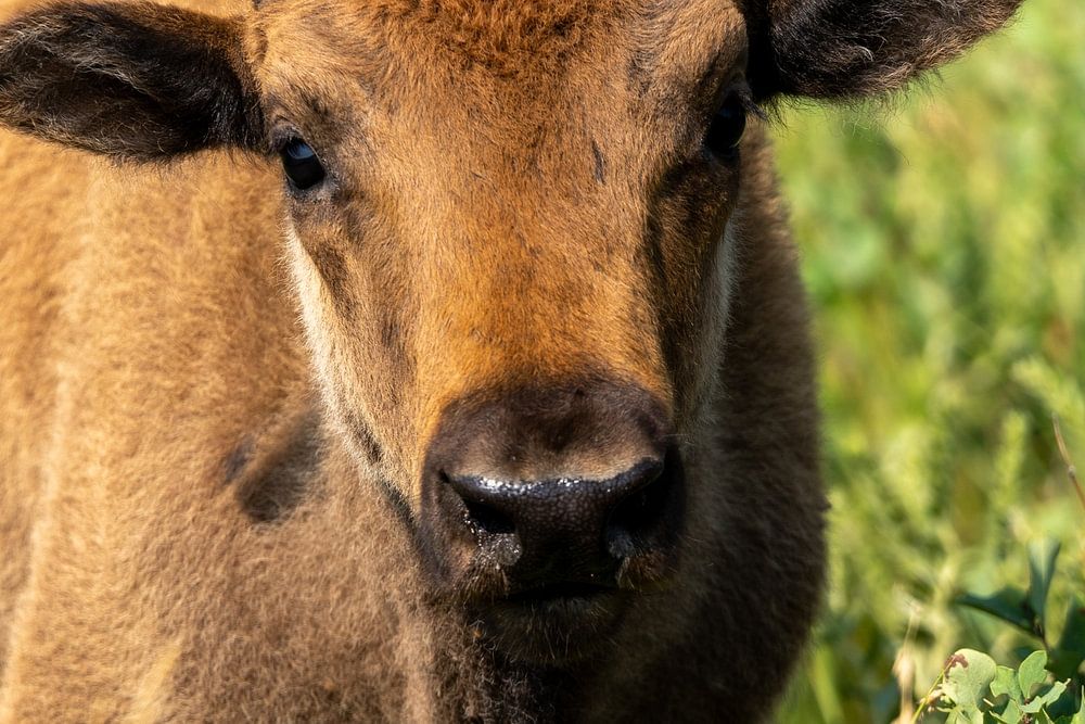 A young bison in the tall flowery grassland of Custer State Park, South Dakota, USA. Young bison are called red dogs.