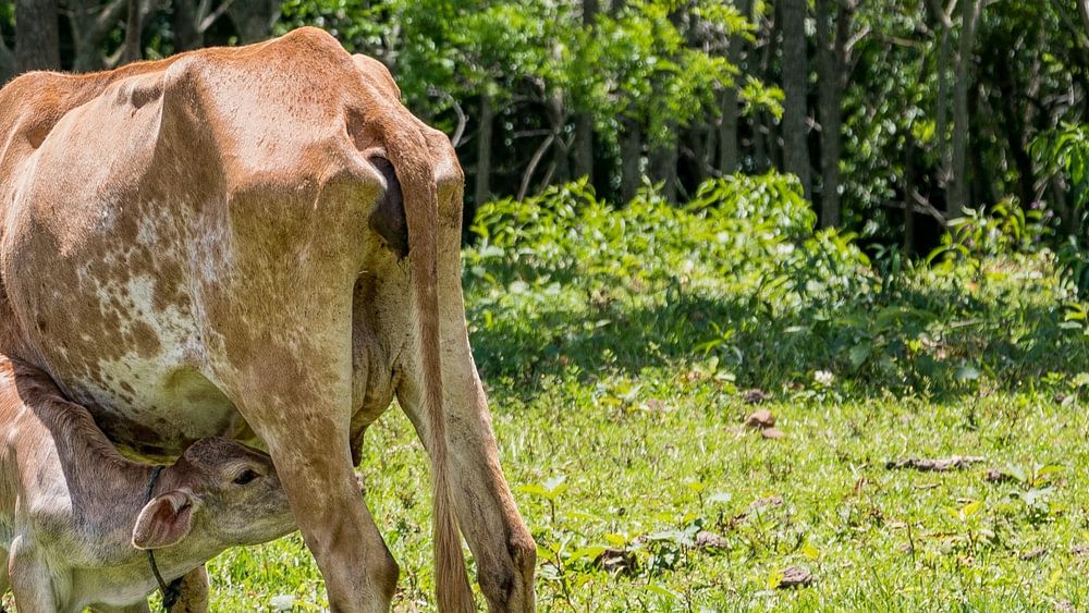 Young calf sucking udder of mother cow by Jan Schneckenhaus