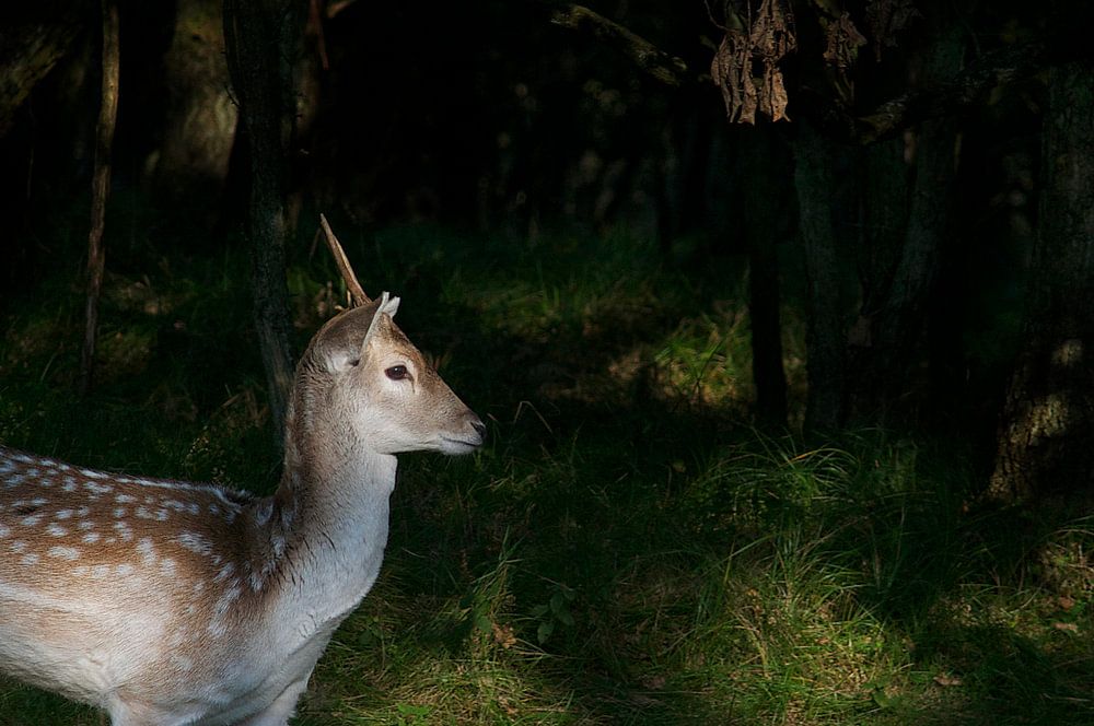 Young male fallow deer walking through a dark area of the Water Supply Dunes