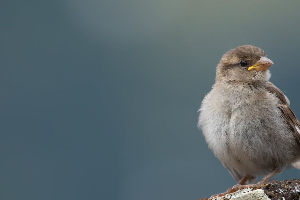 This young sparrow on a roof looks around curiously, waiting for mom and dad. The gray rainy morning provides a fine blue background.