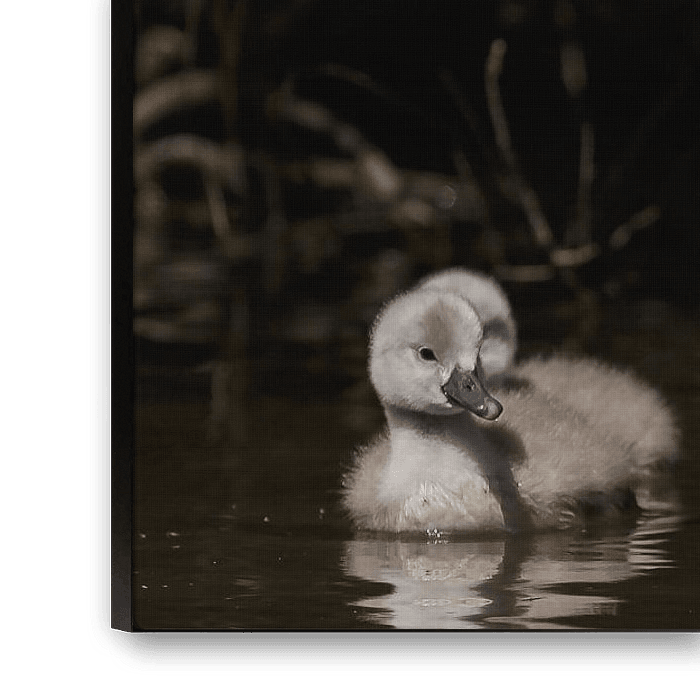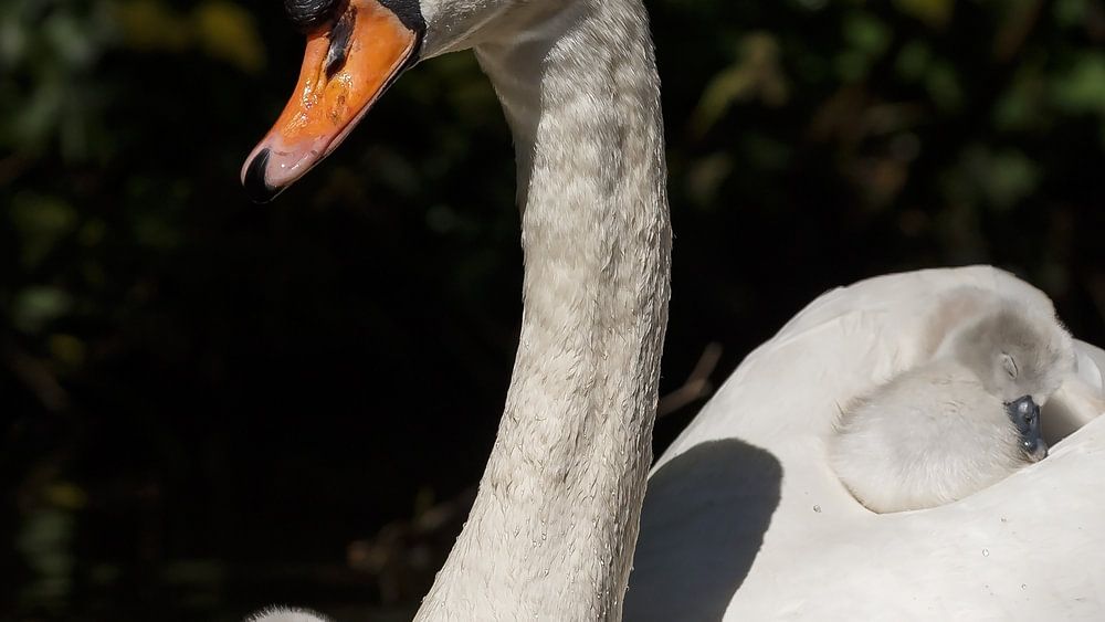 A mother swan and her newly hatched young. The young swan regularly seek out their mother's protective back for a safe rest or just to swim along for a bit.