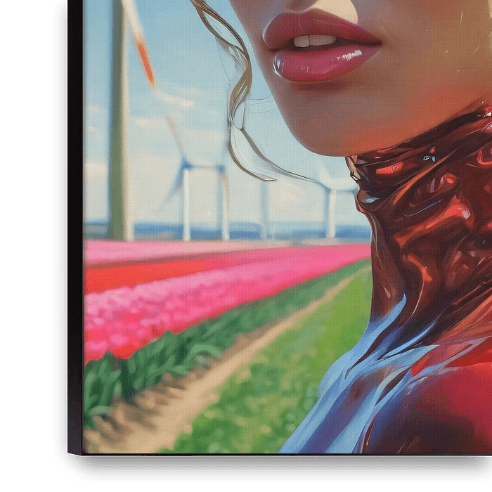 This artwork depicts a stunning, hyper-realistic image of a young woman with bright blue eyes and full, glossy blonde hair that is casually put up. Her skin shines in the sunlight, giving her features an almost ethereal quality. She wears a strikingly shiny metallic red top, which enhances her elegant and confident appearance. Blue…