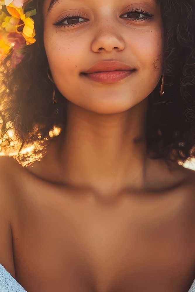 A radiant smile and a blooming wreath of hair give this picture a cheerful, lively aura. The soft colours and warm mood lighting are reminiscent of summer and invite you to relax. This work of art is perfect for the living room, where it creates an inviting and relaxed atmosphere.