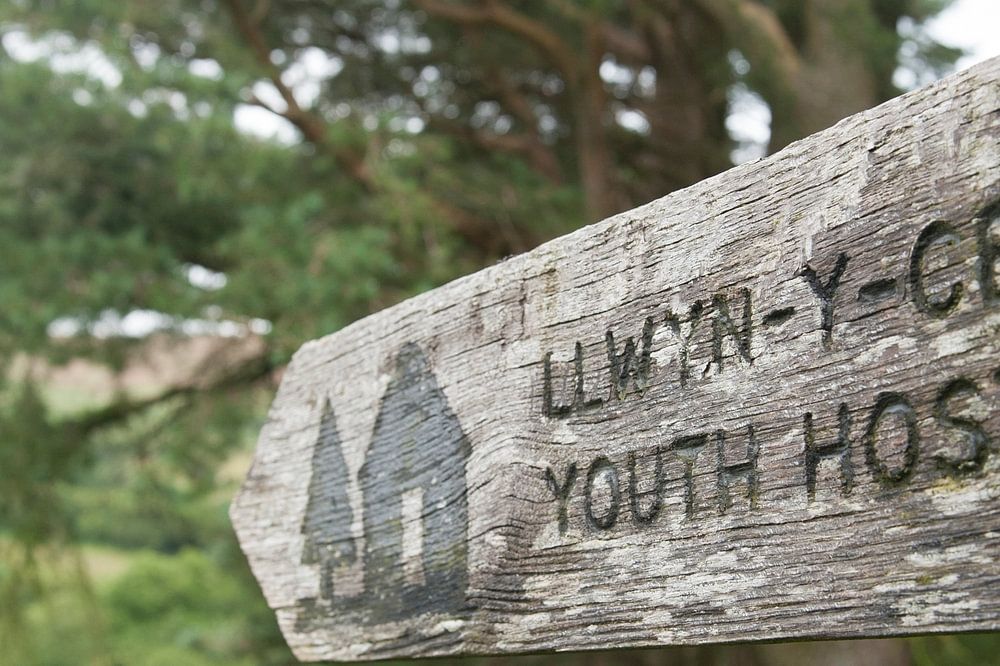 No Libanus Brecon Beacons Wales UK. Wooden footpath sign directing to the Llwyn-y-celyn Youth Hostel.