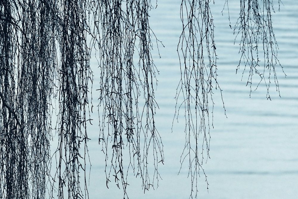 Abstract water landscape at the lake, with a tree in the foreground. The colors are in calm aquatic tones and create a quiet ZEN atmosphere.