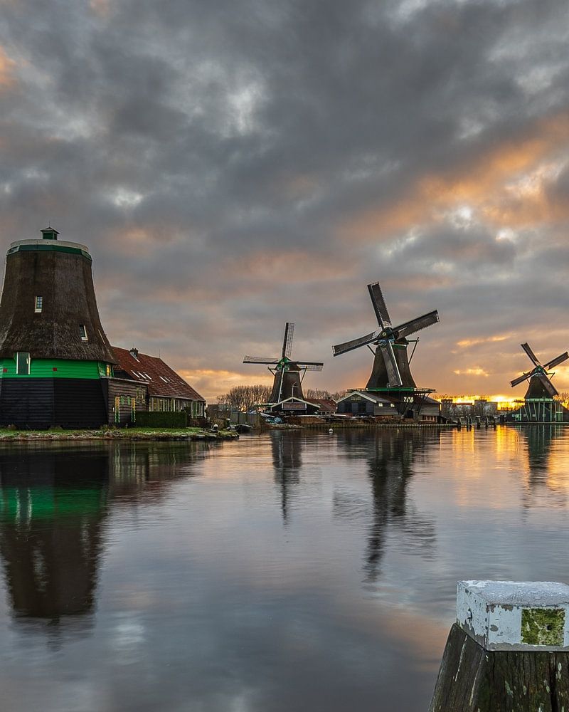 1st week of January 2021 marked the beginning of an upcoming frost period during which ice skating could once again take place in a long time. In this picture, we see a number of mills of the Zaanse Schans during a brightly coloured sunrise, including Oil Mill De Zoeker, Paint Mill De Kat, De Gekroonde Poelenburg and Hot saw mill Het Jonge Schaap