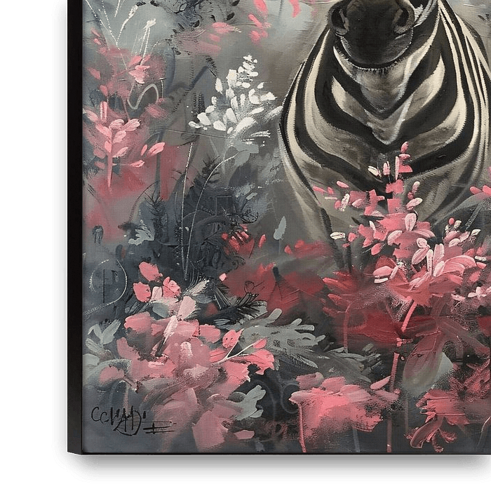 This beautiful painting shows a zebra amidst a colourful field of flowers. The vibrant pink, red and white tones add a playful and modern feel to the artwork. Perfect for lovers of animals and colourful decorations, this painting adds a touch of nature and sophistication to any room. It is ideal for the living room, office or any other…