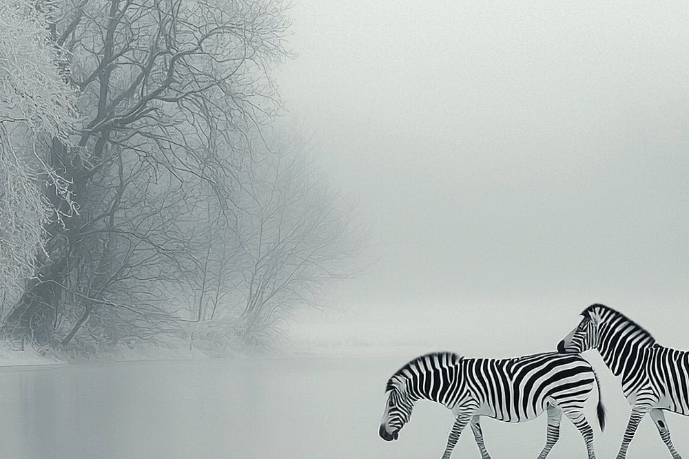 The work raises questions: Did the zebras end up here by accident, or is it a symbolic migration to a new world? The surreal image offers room for interpretation, allowing each viewer to invent their own story.