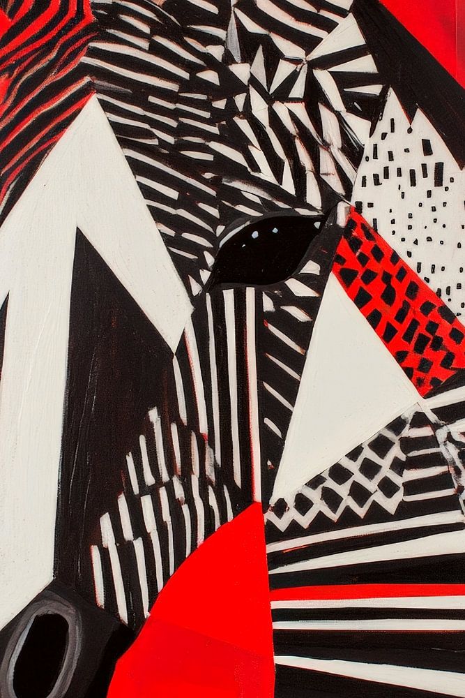 A powerful interplay of bright red and contrasting black and white unfolds here. The geometric patterns of the horse's head give the picture a modern and dynamic touch. Ideal for a living room, it creates a lively centrepiece that stimulates conversation and brings energy into the room.