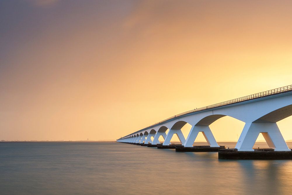 The view with the Zeeland Bridge at sunrise in the golden hour was photographed from the Colijnsplaat area, municipality of Noord-Beveland in Zeeland.