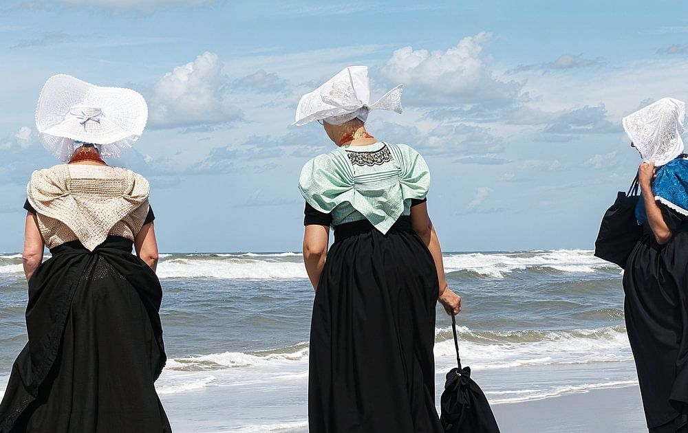 Three women from Zeeland in traditional costume on the beach. They are looking at the North Sea.