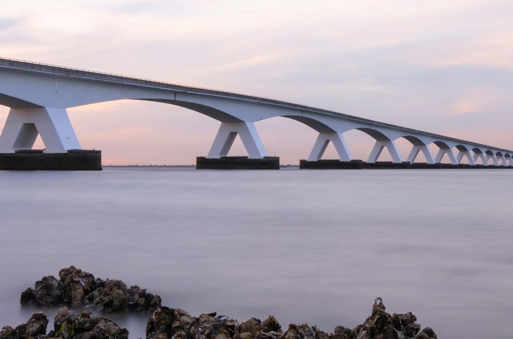 The Zeeland Bridge is the longest bridge in the Netherlands. Because of the symmetry of the pillars, it gives the photo a calm view. The water is blurred due to the long shutter speed used. The colours on the sunset horizon give the image a warm look. The rocks in the foreground give the photo contrast. colour, colours, blue, pink, orange, yellow, landscape, bridges, water, Oosterschelde, Zeeland.