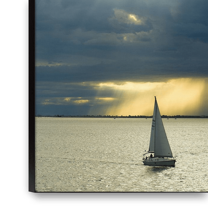 Zeilboot varende onder een donkere wolkenlucht in de baai van Thessaloniki, Griekenland. De zonnestralen verlichten de zee, maar de schaduwkant van de zijlboot steekt strak af tegen het lichtgat in de lucht.